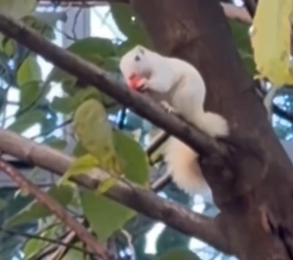 连日来,四川乐山中心城区一只“仙气”十足的白色小松鼠引发关注,无数市民前往拍照打卡。在市民们拍摄的视频中,小松鼠一身雪白的皮毛,拖着蓬松的大尾巴,蹲在星河家园小区外的树上,悠闲地啃食一枚红色果实。